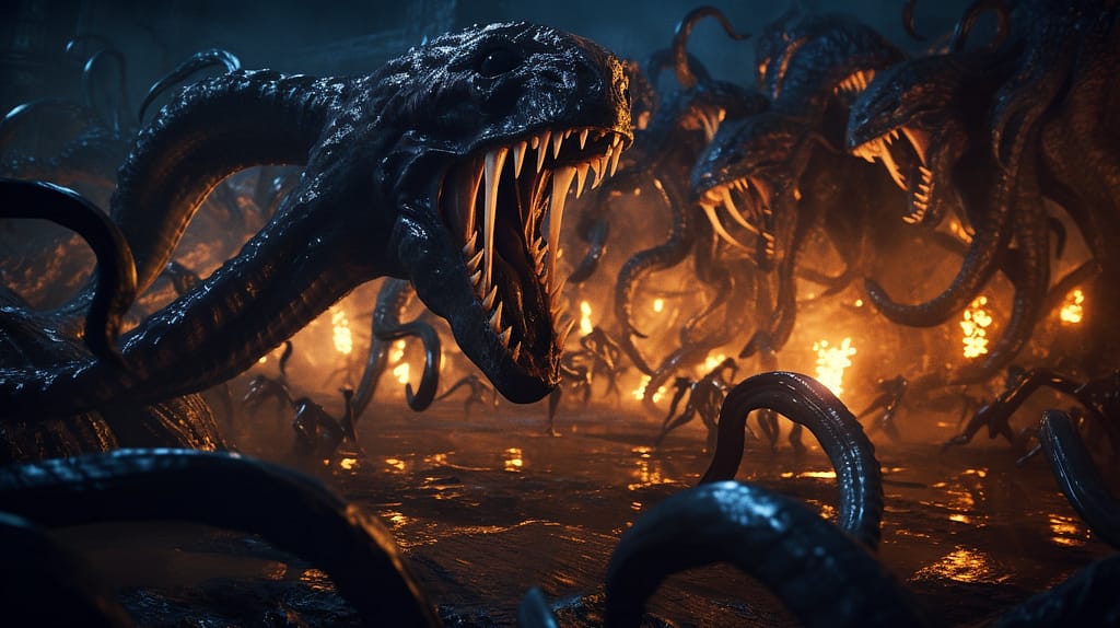 As Aria writhed on the floor, her mind filled with the endless torments of the Void, the Creature shifted its form. From its center sprouted a second head, even more grotesque and menacing than the first. Its maw, filled with razor-sharp teeth, parted and a voice, cold and guttural, filled the room. “I am Nyarlathul, Harbinger of Desolation,” it reverberated, its voice like the grinding of tectonic plates, the language a twisted echo only Calantha could decipher. “I shall gorge myself on your radiance, your life-force itself, before setting my sights on every pinprick of light scattered throughout existence, devouring each until nothing remains but the inky blackness of the void.”