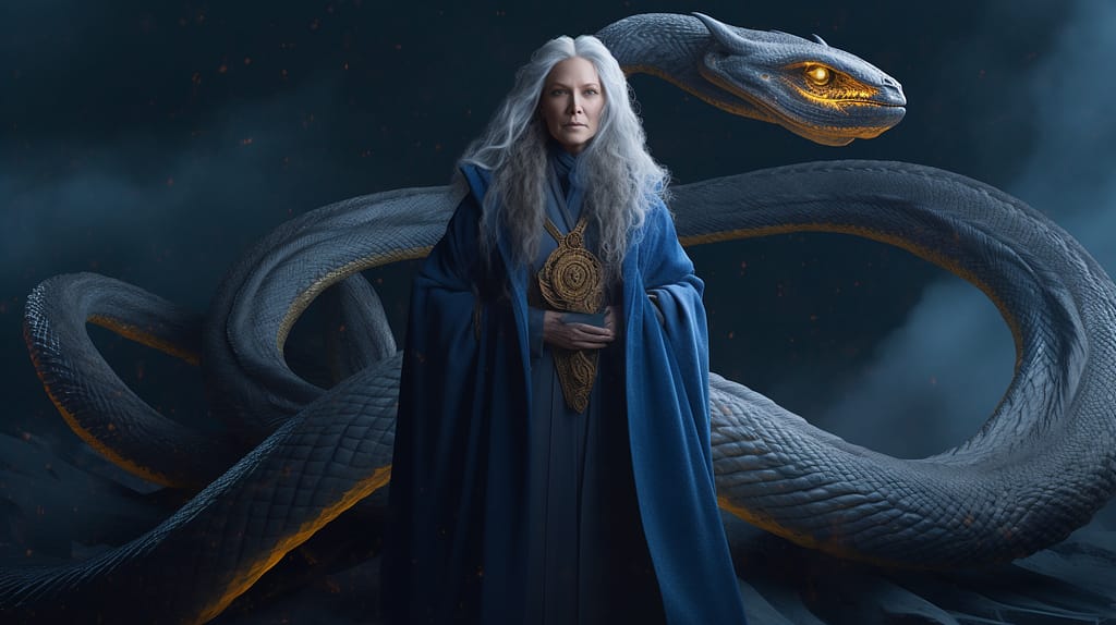 At her side, the Mother Serpent. A creature of paradox and pandemonium, her presence seemed to warp the space around her, transforming the environment with an uncanny sense of the unreal. Her serpentine body, the color of ghostly ash, undulated in mesmerizing patterns, glowing faintly like distant nebulae. Along her underbelly, an expanse of gold stretched, reflecting a warm, otherworldly glow that starkly contrasted the chilling atmosphere. Every time she moved, galaxies seemed to die and be reborn in the eternal cosmic dance reflected in her eyes.